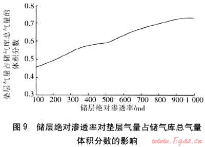 儲(chǔ)層絕對滲透率對墊層氣量占儲(chǔ)氣庫總氣量體積分?jǐn)?shù)的影響見圖9。以含水飽和度大于0.5為停止回采的條件,由圖9可知,儲(chǔ)層絕對滲透率越大,儲(chǔ)氣庫所需的墊層氣量越多。因此,從墊層氣量及氣體混合的角度分析,儲(chǔ)層絕對滲透率越小越好。但是在注氣過程中,絕對滲透率小的儲(chǔ)層,注氣井及地層平均壓力升高很快,對提高儲(chǔ)氣庫的總注氣量不利。因此,在實(shí)際工程中,應(yīng)綜合分析注采過程,選擇具有合適絕對滲透率的儲(chǔ)層,以使儲(chǔ)氣庫的運(yùn)行達(dá)到最優(yōu)化。