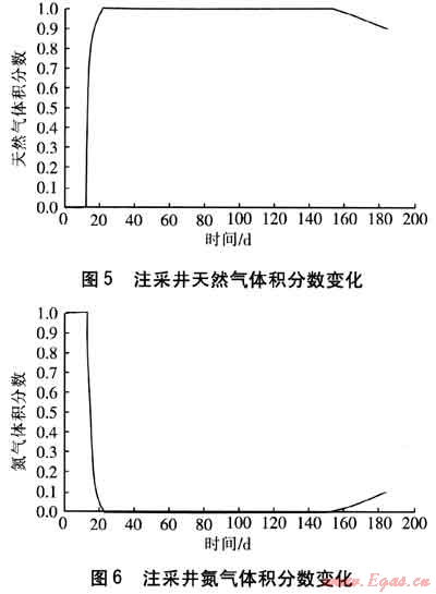 圖5、6為儲(chǔ)氣庫運(yùn)行過程中注采井天然氣及氮?dú)怏w積分?jǐn)?shù)變化情況。最初12d為注入氮?dú)怆A段,天然氣的濃度為0。第13天開始注入天然氣,由于氣體擴(kuò)散,注采井處的天然氣濃度會(huì)逐漸變大,井口處天然氣濃度上升很快。運(yùn)行到第22天時(shí),井口處天然氣體積分?jǐn)?shù)達(dá)到1,此后井口處一直為純天然氣。在回采過程中,初始時(shí)由于距注采井一定距離內(nèi)為純天然氣區(qū),采出氣中天然氣體積分?jǐn)?shù)仍為1。隨著采氣的進(jìn)行,天然氣與氮?dú)獾幕旌蠋Р粩嘞蜃⒉删幰苿?dòng),回采至第148天時(shí),開始出現(xiàn)氮?dú)?,此時(shí)氮?dú)怏w積分?jǐn)?shù)為3×10-6。隨著回采的繼續(xù)進(jìn)行,采出氣中氮?dú)夂吭絹碓酱螅酵V够夭蓵r(shí),氮?dú)怏w積分?jǐn)?shù)達(dá)9.665%。
