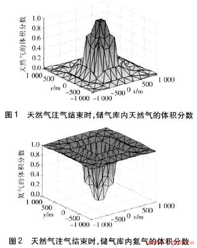 之后開始向儲(chǔ)氣庫注入天然氣,運(yùn)行到第116天時(shí),累積注入量(10022400m3)約達(dá)到目標(biāo)注氣量,停止注氣。天然氣注入結(jié)束時(shí),儲(chǔ)氣庫內(nèi)天然氣及氮?dú)獾捏w積分?jǐn)?shù)見圖1、2。由圖1、2可知,隨著天然氣的注入,天然氣逐漸將氮?dú)庀蛑車?qū)開,因而注采井周圍區(qū)域?yàn)榧兲烊粴鈪^(qū);由于氣體擴(kuò)散,天然氣與氮?dú)庀嗷交欤蚨鴱淖⒉删饾u向外,天然氣的體積分?jǐn)?shù)逐漸減小,氮?dú)獾捏w積分?jǐn)?shù)逐漸增大,形成天然氣與氮?dú)獾幕旌蠋В辉僦饾u向外,為純氮?dú)鈪^(qū)。