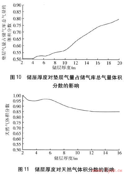 回采到第145天時(shí),儲(chǔ)層厚度對采出氣中天然氣體積分?jǐn)?shù)的影響見圖11。由圖11可知,對于注入相同量的天然氣與氮?dú)?,?chǔ)層厚度越大,兩種氣體混合的程度越大,從氣體混合角度分析,儲(chǔ)層厚度應(yīng)該越小越好,但儲(chǔ)層厚度越小,儲(chǔ)氣量越低。因此,應(yīng)當(dāng)綜合考慮多種因素,選取合適厚度的儲(chǔ)層。從圖11也可以看出,在儲(chǔ)層厚度為4~6m時(shí),采出氣中天然氣的體積分?jǐn)?shù)出現(xiàn)一個(gè)峰值,這就涉及到一個(gè)最佳儲(chǔ)層厚度的問題,既要保證天然氣與氮?dú)獾幕旌铣潭炔挥绊懱烊粴獾氖褂?,又要保證儲(chǔ)氣庫的儲(chǔ)氣量。