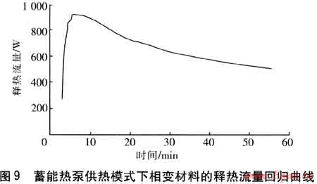 將圖8中的Φc與P相減,得到蓄能熱泵供熱模式下相變材料的釋熱流量,回歸曲線見圖9。由于前2min實(shí)驗(yàn)數(shù)據(jù)不穩(wěn)定且存在Φc<P的情況,因此曲線從第2min給出。與圖7比較,在蓄能熱泵供熱模式運(yùn)行56min后,制冷系統(tǒng)取走了儲(chǔ)存在相變材料中94.6%的熱量。