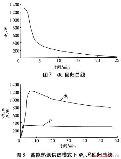 由實(shí)驗(yàn)結(jié)果擬合的蓄能熱泵供熱模式下Φc、P回歸曲線見圖8。與蓄冷模式相比較,由于冷凝溫度的升高,壓縮機(jī)的功率增大。Φc的變化趨勢(shì)與蓄冷模式類似,但是由于初始溫度高于蓄冷模式,相變材料相應(yīng)可提取的液態(tài)顯熱量增加。因此,蓄能熱泵供熱模式在達(dá)到與蓄冷模式相同的蒸發(fā)壓力水平時(shí),所用時(shí)間相應(yīng)延長。