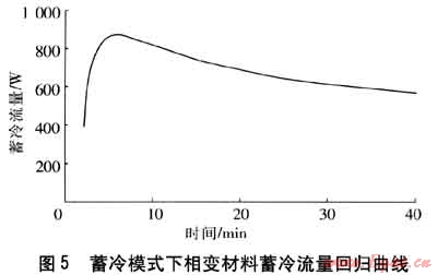 Φc與P之差即為相變材料蓄冷流量(回歸曲線見圖5),由于前2min實(shí)驗(yàn)數(shù)據(jù)不穩(wěn)定且存在Φc<P的情況,因此曲線從第2min給出。隨著運(yùn)行時(shí)間的推移,壓縮機(jī)逐漸穩(wěn)定運(yùn)行,制冷劑與相變材料的換熱流量不斷增大,初期提取的熱量為液態(tài)相變材料的液相顯熱,當(dāng)相變材料溫度進(jìn)入相變區(qū)間時(shí),制冷劑取出的熱量為相變潛熱。