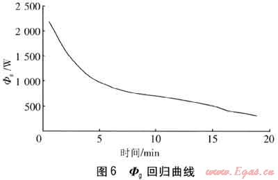 在蓄冷完成后,壓縮機(jī)停機(jī),立即開始取冷實(shí)驗(yàn)。由實(shí)驗(yàn)結(jié)果擬合的Φg回歸曲線見圖6。由圖6可知,取冷實(shí)驗(yàn)持續(xù)時(shí)間為19min,在5~11min,Φg的變化相對(duì)前后兩個(gè)時(shí)間段要平緩,因此這一時(shí)段相變材料處于相變釋冷階段。在19min后,由于相變材料與熱水的溫差較小,因此釋冷緩慢,此時(shí)取冷量已經(jīng)達(dá)到蓄冷量的90%??紤]到取冷時(shí)間較短,以及存在熱損失等因素影響,因此可以基本認(rèn)定:三套管相變蓄能換熱器在蓄釋能過程中能量是基本守恒的。