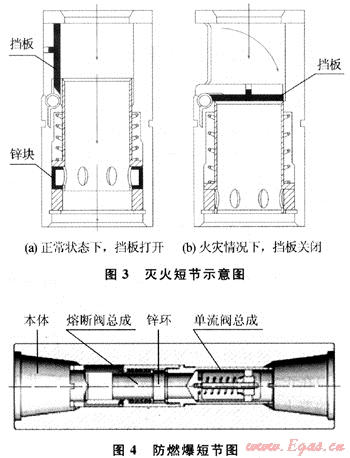 滅火短節(jié)(見圖3、圖4),即鉆柱防火接頭,這是一種低熔點合金制造的閥件,即滅火浮閥,閥內(nèi)裝有一個鋅環(huán)。在正常情況下,循環(huán)的空氣流動壓力使彈簧瓣向下張開,允許空氣循環(huán)通過。一旦環(huán)空著火,溫度上升,當超過設(shè)計溫度時,低熔點合金鋅環(huán)熔化使一個襯套封住空氣流道,關(guān)閉閥門,停止向井底循環(huán)補充空氣,從而切斷氣源使火熄滅。