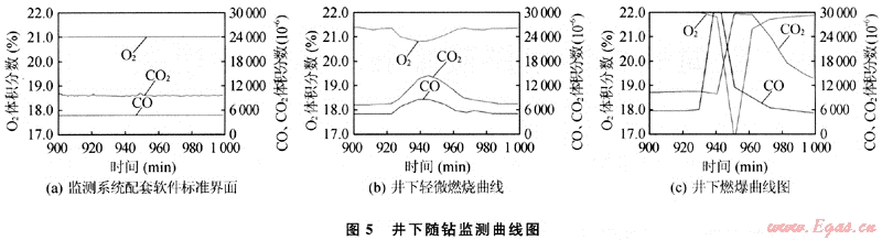 井下隨鉆監(jiān)測系統(tǒng)是專門為監(jiān)測井下燃爆現(xiàn)象而開發(fā)研制的。目前,在現(xiàn)場使用比較成熟的是西南石油大學(xué)研制的UBD氣體監(jiān)測系統(tǒng),其主要原理是在監(jiān)測到烴類氣體的情況下,通過對返出氣體中O2、CO2、和CO體積分數(shù)變化的監(jiān)測來判斷井下是否發(fā)生燃爆。一旦發(fā)生井下燃爆,由于井下燃燒為不完全燃燒,返出氣體中的CO2、CO氣體體積分數(shù)會升高,而O2氣體體積分數(shù)會降低。圖5是3種情況下監(jiān)測界面圖的對比[2]。