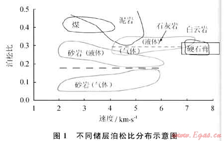 地下介質(zhì)(包括巖層和流體)具有不同泊松比值,國(guó)內(nèi)外學(xué)者在20世紀(jì)70年代對(duì)泊松比與巖性、流體的關(guān)系進(jìn)行了大量研究。漢密爾頓、格里哥里等得到了泊松比與巖石孔隙中流體性質(zhì)關(guān)系的最有價(jià)值的結(jié)果有:①未固結(jié)的淺層鹽水飽和沉積巖往往具有很高的泊松比(大于0.4),這實(shí)際上與泥頁(yè)巖相近;②泊松比往往隨孔隙度的減小及沉積物的固結(jié)而減?。虎鄹呖紫抖鹊柠}水飽和砂巖往往具有較高泊松比(0.3~0.4),這是砂巖含水飽和的情況;④氣飽和高孔隙砂巖往往具有低泊松比,可能低到0.1。這說明含氣層泊松比很低,含水層泊松比明顯增高,致密層更高。更多的研究成果還表明[1~3]:泥頁(yè)巖層泊松比高于砂巖層,碳酸鹽巖地層與砂泥巖層相似。碳酸鹽巖和砂泥巖地層中,含氣與含水的泊松比均有一個(gè)分界線,砂巖地層差異更明顯,石灰?guī)r地層差異略小,但都能分辨出氣水??梢杂檬疽鈭D(圖1)說明儲(chǔ)層泊松比的普遍規(guī)律。
