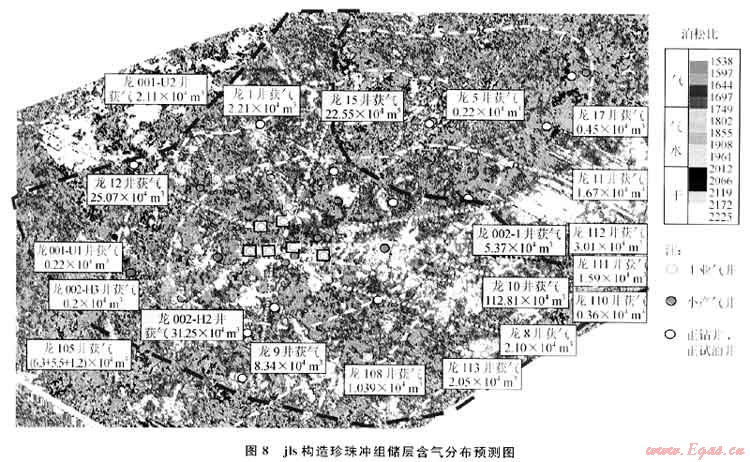 圖9為lg構(gòu)造二疊系生物礁儲(chǔ)層氣水分布預(yù)測(cè)圖。該圖展示,構(gòu)造中部北東南西向有一明顯分界線,西南(左下半部)為臺(tái)地相沉積區(qū),西北部為海槽,中間為臺(tái)緣。預(yù)測(cè)臺(tái)地為含水及差儲(chǔ)層區(qū),中間為臺(tái)緣部位,為預(yù)測(cè)的含氣帶,東北部為海槽,預(yù)測(cè)出大片含氣區(qū)。該構(gòu)造儲(chǔ)層段鉆探大量井位,前期在臺(tái)緣部位取得較好效果,高產(chǎn)井較多(黃色、綠色文字框所示),但后來鉆遇大量氣水井或水井(綠色或藍(lán)色文字框所示),尤其在臺(tái)地部位部署的井位基本上為干井或水井(白色或藍(lán)色文字框所示),獲氣井很少。氣水預(yù)測(cè)結(jié)果與實(shí)鉆結(jié)果基本吻合。預(yù)測(cè)還表明,該區(qū)海槽部位還有大片含氣區(qū),但該區(qū)僅有l(wèi)g10井鉆達(dá)目的層,且不產(chǎn)氣,雖然該井預(yù)測(cè)與實(shí)鉆吻合,但沒有更多的井來證實(shí),且該區(qū)儲(chǔ)層情況還存在認(rèn)識(shí)上的爭(zhēng)議,要靠將來的實(shí)鉆進(jìn)一步驗(yàn)證。