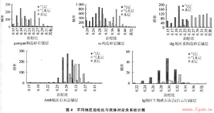 圖4為國(guó)內(nèi)外某些地區(qū)儲(chǔ)層泊松比測(cè)井資料與流體對(duì)應(yīng)關(guān)系統(tǒng)計(jì)圖。從圖中可見,盡管地區(qū)不同,儲(chǔ)層類型不同,但氣水關(guān)系始終具有一致特點(diǎn),即低泊松比對(duì)應(yīng)含氣,中泊松比對(duì)應(yīng)同含氣水,中高泊松比對(duì)應(yīng)含水,高泊松比對(duì)應(yīng)巖層。與前人研究成果都是一致的,只是具體儲(chǔ)層情況有分布范圍的差別。這也說明泊松比這些特點(diǎn)是由儲(chǔ)層及流體的物理性質(zhì)決定的,這種明確的關(guān)系確保了應(yīng)用泊松比進(jìn)行流體識(shí)別的可靠性。