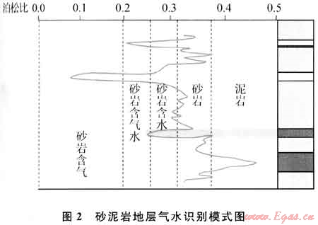 圖2表明,泊松比最低對(duì)應(yīng)氣;泊松比次低對(duì)應(yīng)氣水;泊松比中等對(duì)應(yīng)水;泊松比中高對(duì)應(yīng)砂巖致密層;泊松比很高對(duì)應(yīng)泥巖層。模式中泊松比值的大小具有相對(duì)性,即在不同儲(chǔ)層中,其值的分布范圍及劃分界限可能有所不同。碳酸鹽巖地層(石灰?guī)r及白云巖為主)具有相似的模式,只是巖性和泊松比值大小有區(qū)別。