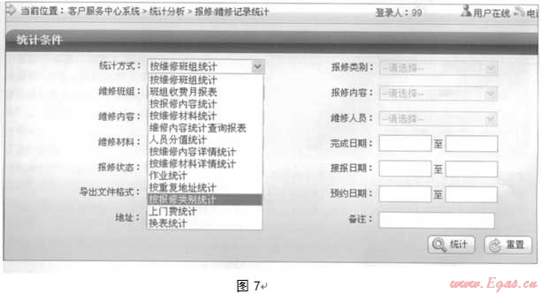 報修維修統(tǒng)計內容比較多,可生成各類統(tǒng)計報表,可根據歷史時問統(tǒng)計報修的數量,同時支持一些關鍵篩選,如用戶報修,巡線報修等。維度可以為:維修班組、報修內容、維修內容、維修人員、維修班組、維修材料、以及報修類型等(見圖7)
