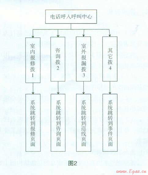 系統(tǒng)數據接口采用三層B/S結構,通過構建應用服務器,把呼叫中心的數據流與燃氣公司營業(yè)客戶系統(tǒng)、報修客服系統(tǒng)結合起來,充分利用了已有系統(tǒng)標準的數據接口,實現(xiàn)對后臺數據庫的訪問。與既有業(yè)務系統(tǒng)接口,融合后臺辦公自動化和T.作流系統(tǒng),系統(tǒng)可以向既有業(yè)務系統(tǒng)提交業(yè)務服務請求,也可以取得既有業(yè)務的數據。如煤氣費查詢、欠費信息等(可根據用戶欠費情況要求用戶先交費再維修,維護了公司利益)。系統(tǒng)聯(lián)通了呼叫中心座席人員、營業(yè)廳收費人員、抄表班業(yè)務員、工程管理人員與公司管理人員等各種角色使用系統(tǒng)的界面,使各類人員都能查詢到自己所需的數據。