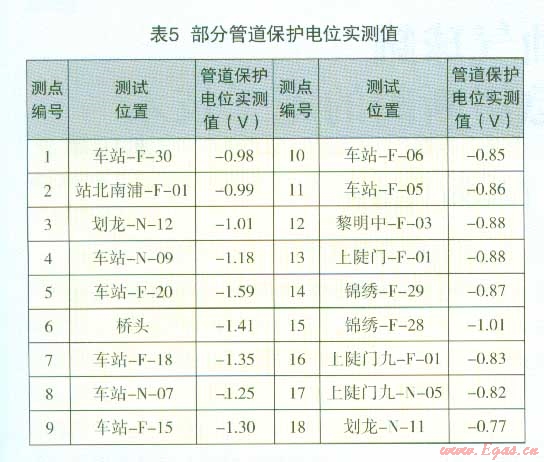 區(qū)域二兩座深井陽(yáng)極安裝后,對(duì)管網(wǎng)進(jìn)行了-段時(shí)間的極化,各測(cè)試點(diǎn)保護(hù)電位測(cè)試結(jié)果見表5,大多數(shù)檢測(cè)點(diǎn)的電位在-0.85V至-l.5V之間,達(dá)到了保護(hù)電位,但也有小部分電位在-0.85V以卜達(dá)不到保護(hù)電位,個(gè)別在-1.5v以下,管網(wǎng)處于過(guò)保護(hù)狀態(tài)。