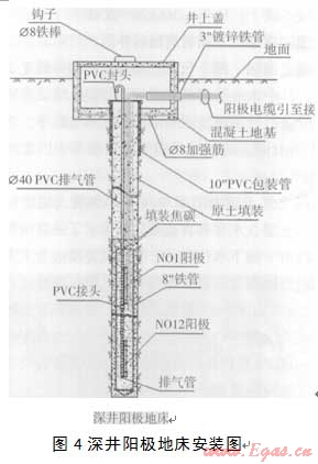 公司于2011年3月苗‘先啟動(dòng)了Ⅸ域二的深井陽(yáng)極電流保護(hù)工程。經(jīng)計(jì)算管道保護(hù)面積為19 631m2,設(shè)計(jì)保護(hù)電流密度為lomA/m2,保護(hù)總電流為196A,在南浦氣化站和位于車站大道的公用集團(tuán)內(nèi)各設(shè)置1座深井陽(yáng)極陰極保護(hù)站。每個(gè)站內(nèi)設(shè)l00A/100V恒電位儀2臺(tái),-開-備。在站內(nèi)距離管線50m~100m的低洼潮濕、土層較厚處鉆建直立式陽(yáng)極地床,升深60m,井內(nèi)裝分段預(yù)制型陽(yáng)極體7組,規(guī)格為Ф325×6 000,內(nèi)裝Ф75×1 500高硅鑄鐵陽(yáng)極3支。將高硅鑄鐵陽(yáng)極、高性能碳素填料,PVC排氣管,部分陽(yáng)極引線電纜,井套管組合裝配為-體,便于運(yùn)輸和安裝,并可保證裝配精度和質(zhì)量(圖4)。每500m左有設(shè)置-個(gè)測(cè)試樁或在原有閥門井內(nèi)設(shè)置測(cè)試點(diǎn)。對(duì)于平行或跨越管道按-定間距或在最接近處作均壓處理,使電位分布均衡。