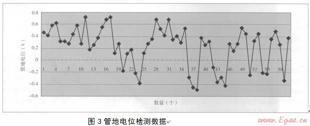 對(duì)整體管道的自然電位測(cè)試和原犧牲陽(yáng)極保護(hù)系統(tǒng)進(jìn)行測(cè)試,大部分管道處在自然腐蝕電位狀態(tài)(-0.45V,Cu/CuS04參比電極),所測(cè)的60處管地電位在-0.49V~-0.72V之間波動(dòng)(見圖3),其中正值占77%,最負(fù)值-0.49V,達(dá)不到管道陰極保護(hù)電位(即管/地界面極化電位)要求的-0.85V,即管道運(yùn)行沒有處于陰極保護(hù)狀態(tài)。