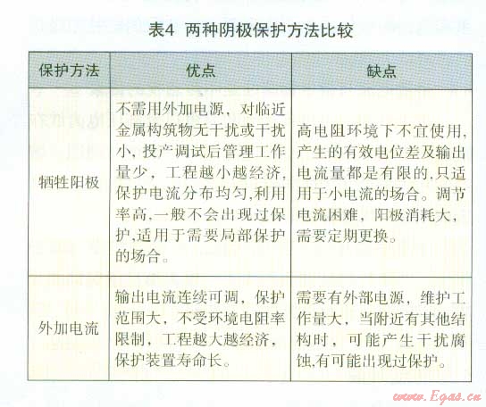 陰極保護(hù)是給被保護(hù)物體通以陰極電流,使之陰極極化減小或防止金屬腐蝕的方法,主要有犧牲陽(yáng)極法和外加電流法(也稱強(qiáng)制電流法)兩種,兩者比較如表4。