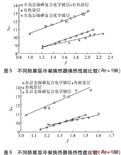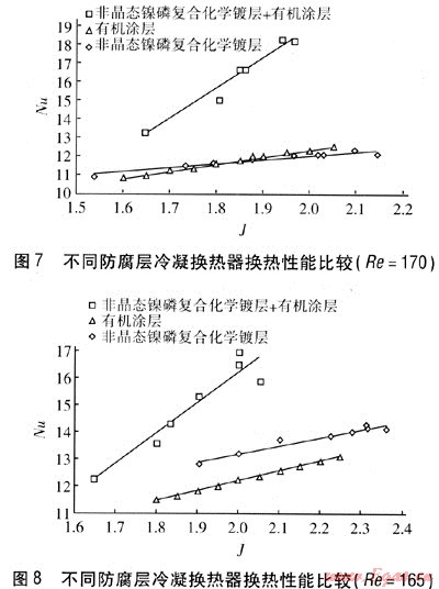 本實(shí)驗(yàn)通過對(duì)不同防腐層冷凝換熱器換熱性能的測定得出,冷凝換熱器換熱性能不僅隨Re和J的增大而增強(qiáng),而且對(duì)于不同防腐層的冷凝換熱器,其換熱性能隨Re和J的變化速率也不同;在相同工況下,3種不同防腐層的冷凝換熱器的換熱性能不同,非晶態(tài)鎳磷復(fù)合化學(xué)鍍層+有機(jī)涂層冷凝換熱器換熱能力最強(qiáng),有機(jī)涂層冷凝換熱器換熱能力與非晶態(tài)鎳磷復(fù)合化學(xué)鍍層冷凝換熱器換熱能力相當(dāng)。