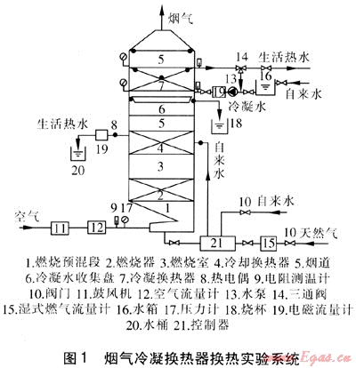 水系統(tǒng):本實(shí)驗(yàn)將冷卻段和冷凝段的水路分開,讓冷卻水分兩路分別進(jìn)入冷卻換熱器4和冷凝換熱器7。進(jìn)入冷卻換熱器的水與煙氣換熱后流經(jīng)電磁流量計(jì)19后流入水桶20中,用作生活熱水。對(duì)于進(jìn)入冷凝換熱器的冷卻水,通過調(diào)節(jié)三通閥14的回水量,即調(diào)節(jié)冷熱水比例來調(diào)節(jié)冷卻水進(jìn)水溫度,冷卻水與煙氣換熱,部分通過三通閥14進(jìn)行循環(huán),部分流出,作為生活熱水。在冷凝段的水路上,加設(shè)水箱定壓,以消除水壓不穩(wěn)對(duì)進(jìn)入冷凝換熱器的冷卻水流量的影響。