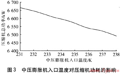 圖3是在固定原料氣壓縮后壓力和制冷劑進(jìn)入冷箱壓力的情況下,原料氣壓縮機(jī)和制冷劑壓縮機(jī)總功率隨著中壓膨脹機(jī)入口溫度的變化曲線。由圖3可見,隨著中壓膨脹機(jī)入口溫度升高,系統(tǒng)總功耗減小。這是因為隨著中壓膨脹機(jī)入口溫度升高,1號換熱器熱負(fù)荷減小,隨之系統(tǒng)總熱負(fù)荷減小,故制冷劑壓縮機(jī)功耗降低。但中壓膨脹機(jī)入口溫度不能過高,否則2號換熱器將出現(xiàn)負(fù)溫差而不能正常工作。