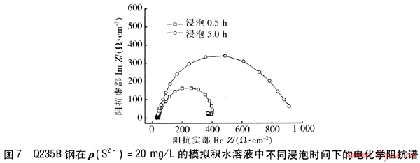 圖7為Q235B鋼在ρ(S2-)=20mg/L的模擬積水溶液中分別浸泡0.5h和浸泡5h所得的電化學(xué)阻抗譜。由圖7可知,隨浸泡時(shí)間的不同,Nyquist圖的形狀有明顯不同。浸泡時(shí)間短時(shí),Nyquist圖由一個(gè)高頻容抗弧和一個(gè)低頻小感抗弧組成。當(dāng)浸泡時(shí)間由0.5h增大到5h時(shí),Nyquist圖表現(xiàn)為一個(gè)大容抗弧,低頻感抗弧已經(jīng)消失,且大容抗弧的半徑顯著變大,即其阻抗增大。說明在模擬積水溶液中,隨著浸泡時(shí)間的延長(zhǎng),S2-對(duì)Q235B鋼表面電化學(xué)反應(yīng)的抑制作用增強(qiáng)。