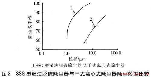 SSG型濕法脫硫除塵器與干式離心式除塵器除塵效率比較見圖2。由圖2可知,對于粒徑為1~10μm的飄塵,SSG型濕法脫硫除塵器的除塵效率為60%~100%;對于粒徑為6~10μm的飄塵,干式離心式除塵器的除塵效率為55%~70%;而對于粒徑為6μm以下的飄塵,干式離心式除塵器幾乎沒有捕集能力。SSG型濕式除塵器除塵效率曲線總是位于干式離心式除塵器除塵效率曲線的上方,無論對于何種粒徑的煙塵,SSG型濕法除塵器的除塵效率均大于干式離心式除塵器。