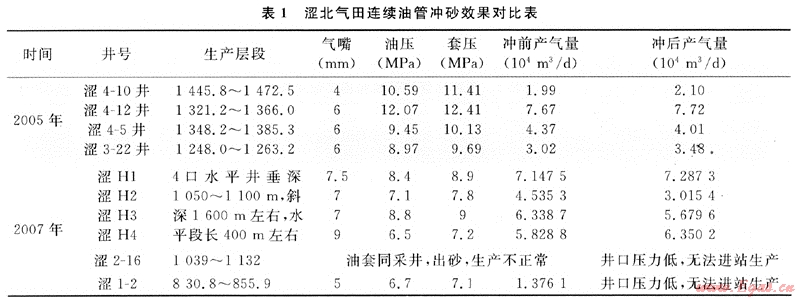 2005年在4口直井、2007年選擇了4口水平井和2口出水較多、有出砂現(xiàn)象的直井實(shí)施了連續(xù)油沖砂作業(yè),其效果見表1。