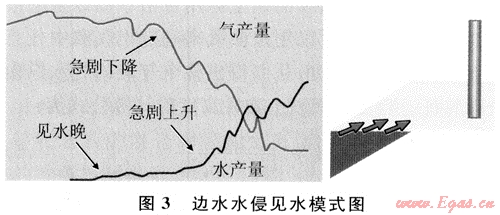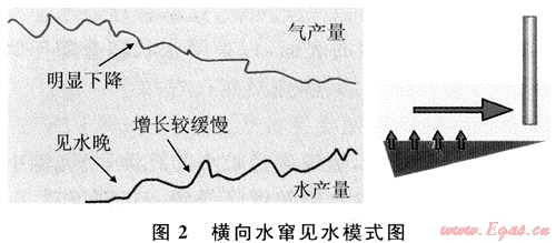 層間壓差導致層間水首先沿縱向侵入到相鄰層,然后再在層內(nèi)推動下沿平面高滲透條帶或水平微裂縫橫向推進到氣井(圖2)。由于水進路線長,氣井出水通常較晚,但一旦見水,出水量將持續(xù)增加,產(chǎn)氣量明顯下降。