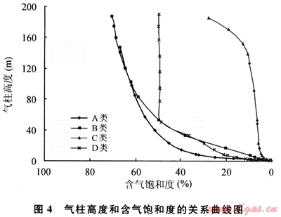 毛細管力曲線與地下流體飽和度具有函數(shù)關系,而自由水面以上的氣液柱高度又是由毛細管力決定的,因此,地下流體飽和度也是自由水面以上氣液柱高度的函數(shù),氣柱高度等于自由水面以上氣液柱高度減去靜水壓力對應的自由水面以上液柱高度。據(jù)此,利用澀北疏松砂巖氣藏4類典型的毛細管力曲線,就可以計算得出氣柱高度和含氣飽和度之間的關系曲線(圖4)。