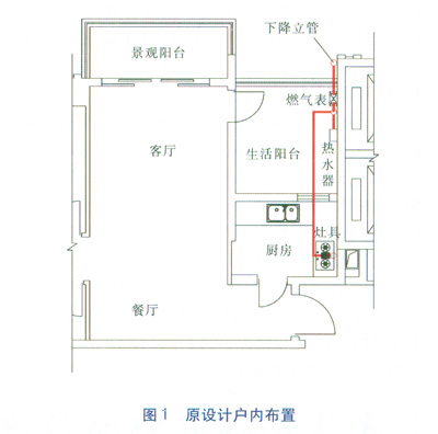 某樓盤所有戶型都是房地產(chǎn)精裝修,一些戶型的廚房位于進(jìn)戶大門旁,廚房的窗口外面是敞開式生活陽(yáng)臺(tái),客廳和餐廳左側(cè)是兩房間,燃?xì)饬⒐馨惭b在敞開式生活陽(yáng)臺(tái)外側(cè),燃?xì)獗砗蜔崴饕差A(yù)先安裝在敞開式生活陽(yáng)臺(tái)上,燃?xì)獗砬叭細(xì)夤艿兰芸辗笤O(shè)在敞開式生活陽(yáng)臺(tái)的墻上,表后管道采用銅管直埋于墻壁,并沿墻壁下來直接進(jìn)入地板內(nèi)敷設(shè),從而連接熱水器和燃?xì)庠?。這種布置方式是符合規(guī)范要求的。原設(shè)計(jì)戶內(nèi)布置見圖1。