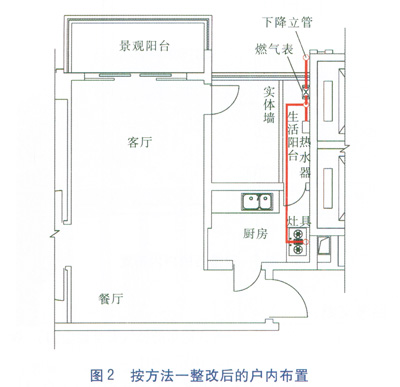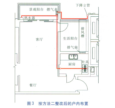 這個(gè)方法的優(yōu)點(diǎn)是先前做好的燃?xì)庠O(shè)施不用重新布置,也基本滿足了用氣條件。其缺點(diǎn)是敞開式生活陽(yáng)臺(tái)變小了,廚房的窗戶變成門,造成櫥柜變少了,業(yè)主意見不一。