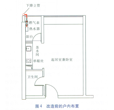 舉例:有一公寓戶型,茶水間作為廚房用,布置有煙道、單眼灶和洗手盆,并與起居室兼臥室相連。由于此戶型衛(wèi)生間是暗室,因此,熱水器只能安裝在陽(yáng)臺(tái)上,燃?xì)饬⒐馨惭b在陽(yáng)臺(tái)外側(cè),燃?xì)獗戆惭b在陽(yáng)臺(tái)上,表前燃?xì)夤艿姥貕芸辗笤O(shè),表后燃?xì)夤艿啦捎勉~管直埋于墻壁,并引至熱水器。GB 50028—2006第10.4.2條規(guī)定,居民生活用氣設(shè)備嚴(yán)禁設(shè)置在臥室內(nèi)。因此,此戶型的茶水間不具備用氣條件,原設(shè)計(jì)時(shí)我們也沒有將燃?xì)夤艿酪氩杷g,而只供熱水器使用燃?xì)?。改造前的戶?nèi)布置見圖4。