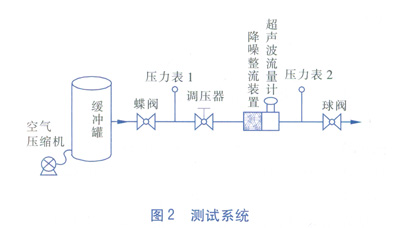 試驗(yàn)中,用來產(chǎn)生超聲波噪聲的設(shè)備是調(diào)壓器。在氣體流動的過程中,調(diào)壓器兩側(cè)的壓力差越大所產(chǎn)生的超聲波噪聲越大。本測試的方法是:在一個容積為5m3的緩沖罐中充入空氣,使其內(nèi)部達(dá)到500kPa左右的絕對壓力,緩沖罐的一側(cè)接有DN 50mm的管道,管道上依次接有蝶閥、壓力表1、調(diào)壓器、降噪整流裝置、AS超聲波流量計(jì)、壓力表2和球閥。為了模擬實(shí)際使用現(xiàn)場,特約束了它們之間的距離。蝶閥與壓力表1相距10D(D為管道公稱直徑),壓力表1與調(diào)壓器相距15D,調(diào)壓器與降噪整流裝置相距5D,降噪整流裝置與AS超聲波流量計(jì)直接連接,超聲波流量計(jì)與壓力表2相距10D,壓力表2與球閥相距10D,測試系統(tǒng)見圖2。選用的AS超聲波流量計(jì)規(guī)格為DN 50mm,始動流量為0.37m3/h,流量范圍為3~150m3/h。