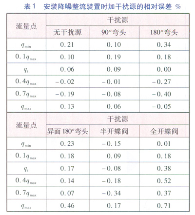 試驗(yàn)的流程為:先在被檢表位置安裝降噪整流裝置和AS超聲波流量計(jì),在無干擾源的情況下進(jìn)行檢定;檢定完成后在降噪整流裝置的上游安裝上干擾源,按照以上流量點(diǎn)再次進(jìn)行檢定。檢定完畢后統(tǒng)計(jì)數(shù)據(jù),進(jìn)行分析,具體數(shù)據(jù)見表1。測試了常見的5種干擾源,分別為:90°彎頭、180°彎頭、異面180°彎頭、半開的蝶閥、全開的蝶閥。