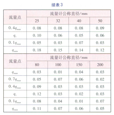 試驗(yàn)的方法為:在標(biāo)準(zhǔn)表校驗(yàn)裝置上被檢表的位置安裝好待測的儀器后,按照校驗(yàn)流量計(jì)的方法分別對qmin、0.1qmax、qt、0.4qmax、0.7qmax和qmax的流量點(diǎn)進(jìn)行校驗(yàn)。qmin為流量計(jì)的標(biāo)稱最小流量;qmax為流量計(jì)的標(biāo)稱最大流量;qt為分界流量,即流量范圍被分割成“高區(qū)”和“低區(qū)”的分界點(diǎn)的流量,“高區(qū)”的準(zhǔn)確度等級為流量計(jì)的標(biāo)稱準(zhǔn)確度等級,“低區(qū)”的準(zhǔn)確度等級為流量計(jì)的標(biāo)稱準(zhǔn)確度等級的2倍。