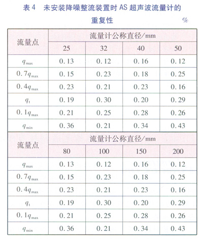 為了使得試驗(yàn)結(jié)果更具有對比性,把各個口徑的AS超聲波流量計(jì)拆下降噪整流裝置后按照所校驗(yàn)流量點(diǎn)進(jìn)行檢定,并統(tǒng)計(jì)各個流量點(diǎn)的重復(fù)性,見表4。