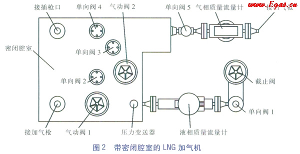③LNG加氣機加氣流程:LNG從加氣機進液管道流向截止閥、單向閥1、液相質(zhì)量流量計、氣動閥1、金屬軟管、加氣槍,然后進入車載氣瓶。