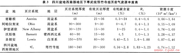 為確定四川盆地西南部地區(qū)下寒武統(tǒng)筇竹寺組頁巖氣資源豐度,筆者在威遠(yuǎn)氣田區(qū)實(shí)施了1口鉆井密閉取心,并對(duì)其進(jìn)行巖心吸附氣含量測試。威遠(yuǎn)氣田區(qū)下寒武統(tǒng)筇竹寺組頁巖有機(jī)碳含量為0.34%~2.8%,吸附氣含量0.43~0.86m3/t。需要說明的是根據(jù)區(qū)域地層研究,上述鉆井沒能得到該組中最好的黑色頁巖和碳質(zhì)頁巖段巖心,因此,測得的有機(jī)碳與吸附氣含量僅具有不完全代表性,這一問題有待繼續(xù)研究。將筇竹寺組頁巖特征與美國五大頁巖氣含氣盆地對(duì)比(見表3),確定出四川盆地西南部地區(qū)下寒武統(tǒng)筇竹寺組頁巖氣資源豐度為0.74×108~1.52×108m3/km2。