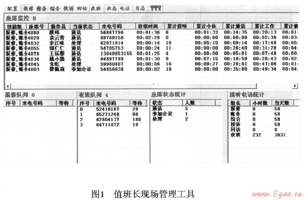 請注意,此處“當前狀態(tài)”顯示的信息正是本文前述“工作狀態(tài)量化考核”中提及的基本內(nèi)容。如果“狀態(tài)”時間超標,對應(yīng)的“持續(xù)時間”一列數(shù)據(jù)顯示就會變成紅色,提示值班長應(yīng)予重點關(guān)注,必要時進行適當干預(yù),確保服務(wù)熱線現(xiàn)場工作有序進行。管理工具的下半部顯示出各技能分組隊列放置情況、當前話務(wù)統(tǒng)計數(shù)據(jù)及坐席人員配置現(xiàn)狀。一旦有情況,當班值班長可以根據(jù)隊列狀態(tài)及時調(diào)整相關(guān)技能組的人員配置。