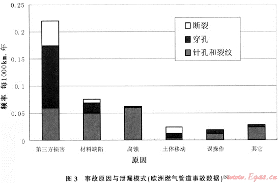 實(shí)踐證明,管網(wǎng)長期低壓運(yùn)行,一旦升高管網(wǎng)運(yùn)行壓力將增大由于材料缺陷和腐蝕引起天然氣泄漏的機(jī)率。但是從歐洲燃?xì)夤艿赖慕y(tǒng)計(jì)數(shù)據(jù)來看(圖3)。管道自身原因?qū)е碌男孤┩容^輕微(針孔和裂紋)。發(fā)生重大事故的可能性較小。因此,升壓運(yùn)行帶來的風(fēng)險(xiǎn)并不大,并且完全可以通過采取必要的保護(hù)措施加以規(guī)避。