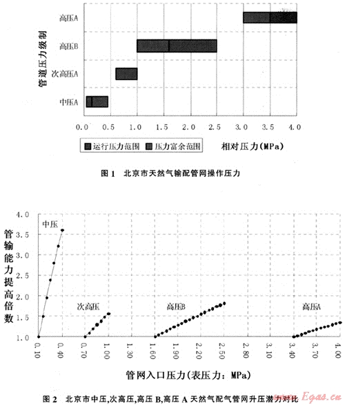 2008年—2009年冬季高峰日輸送氣量為4230萬m3,小時(shí)高峰輸送量為210萬m3。自1997年以來,年高峰日輸送量平均增長率超過40%。若實(shí)現(xiàn)北京市120億m3天然氣供應(yīng)量目標(biāo),據(jù)測算,高峰輸送量為10500萬m3,高峰小時(shí)輸送量為580萬m3。在現(xiàn)有管網(wǎng)最大運(yùn)行壓力下,提高輸送能力的方法。一是增加進(jìn)氣點(diǎn)既建調(diào)壓站,二是增加管線建設(shè)。北京天然氣高壓以上管線僅占總管線長度的8.6%,合理增建高壓管線是有必要的,也是有條件的。但中壓管線已占總管線長度的40%,中壓天然氣管線幾乎遍布市區(qū)所有主干公路,據(jù)北京天然氣管網(wǎng)規(guī)劃。2020年中壓管網(wǎng)輸送能力將由目前150萬m3增加到255萬m3。單靠增加中壓管線建設(shè)提高管網(wǎng)輸送能力即不經(jīng)濟(jì)也不現(xiàn)實(shí)。因此,如何提高現(xiàn)有管網(wǎng)的輸送能力,是我們亟待解決的問題。