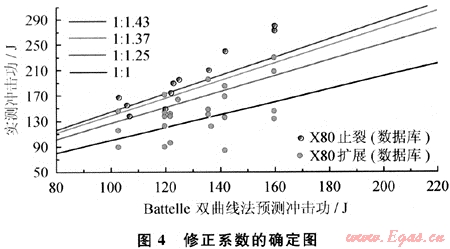新頒布的ISO 3183 2007中給出了幾種常用的止裂韌性預測方法的適用范圍(見表2)。可見,對于西二線,只有Battelle雙曲線法適用。ISO 3183—2007進一步指出,當預測結(jié)果大于100J時,應對預測結(jié)果進行修正。而修正系數(shù)是由已經(jīng)進行的全尺寸實物爆破試驗結(jié)果確定的。由圖4得出西二線止裂韌性修正系數(shù)為1.43。幾種預測結(jié)果對比如表3所示。