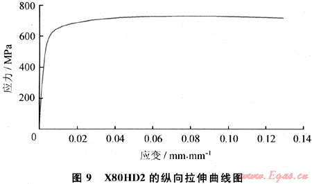 用于西二線的抗大變形鋼管已試制成功。表4是西二線抗大變形管線鋼技術(shù)條件對縱向拉伸性能的要求。表5為外徑1219mm、壁厚22mm X80HD2鋼管的縱向拉伸性能測試結(jié)果。圖9為其縱向拉伸曲線。根據(jù)此拉伸曲線,利用FEM(Finite Element Method)方法進行壓縮和彎曲載荷下的應變能力計算,結(jié)果見表6。