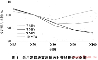 在日益激烈的市場競爭中,全球各石油公司都在不斷尋找降低成本的途徑。在管線項目投資中,鋼管的成本占40%左右,采用高鋼級管線鋼管可以減小壁厚,高壓輸送可以在不改變輸量的情況下減小管徑。管徑和壁厚的減小可帶來工程費用的降低。因此,采用高鋼級管線鋼管和高壓輸送可有效降低輸送成本。在1998年舉行的國際管道會議上,加拿大的NOVA公司介紹了該公司采用高鋼級管線鋼管和高壓輸送的效益情況[5]。圖1所示為采用不同鋼級管線鋼管和不同輸送壓力時管線的投資對比情況[5]??梢姡诟邏狠斔蜁r,采用高鋼級管線鋼管可明顯降低管道成本。