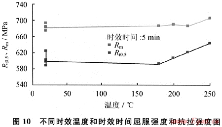 應變時效是鋼經(jīng)過冷塑性變形后,在室溫長時間放置或稍加熱后,其力學性能發(fā)生變化(通常是屈服強度增高,屈強比提高,并伴有塑性和韌性降低)現(xiàn)象。原因是存在于鋼中的溶質(zhì)組元如C、N原子通過擴散在位錯周圍偏聚,形成柯氏(Cottrell)氣團,使位錯運動變得困難,導致屈服強度升高。圖10為X80鋼管在不同時效條件下屈服強度和抗拉強度的變化情況。由圖10可見,隨著時效溫度升高和時效時間的延長,鋼管的抗拉強度變化不明顯,但屈服強度則明顯上升。在實際防腐過程中,時間一般只有5min左右。而從試驗結(jié)果來看,防腐溫度在200℃以下時,屈服強度沒有明顯變化。因此可以規(guī)定防腐時的加熱溫度不宜超討200℃。