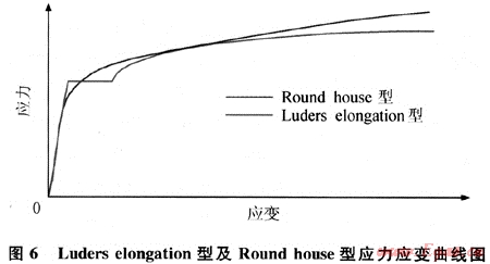 典型的管線鋼應力應變曲線有Luders elongation型及Round house型兩種,如圖6所示。研究表明,Round house型管線鋼的變形能力優(yōu)于Luders elongation型管線鋼[12],其屈曲應變遠高于Luders elongation型管線鋼。