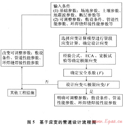 中石油《西氣東輸二線工程關(guān)鍵技術(shù)研究》重大專項設置課題研究了西二線基于應變的設計方法并進行了抗大變形管線鋼的研究與開發(fā)。中石油規(guī)劃設計總院和管道設計院編制了《西氣東輸二線管道工程強震區(qū)和活動斷層區(qū)段埋地管道基于應變設計導則》[10~11]?;趹兊墓艿涝O計流程如圖5所示。核心環(huán)節(jié)是設計應變小于等于極限應變/安全系數(shù)。此處的極限應變就是鋼管應力-應變曲線中的屈曲應變。它可以直接由鋼管實物試驗測出,也可由經(jīng)驗公式、ECA(Engineer Critical Assessment)、寬板試驗等確定。