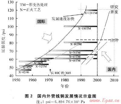 提高管線鋼管鋼級和輸送壓力是天然氣管道建設強勁的發(fā)展趨勢,API標準的發(fā)展也反映了這種趨勢。圖2為我國與發(fā)達國家管線鋼發(fā)展情況對比示意圖[6]。20世紀90年代之前,我國天然氣管道普遍采用A3、16Mn、TS52K等低強度焊管,輸送壓力大都在4MPa以下。我國按API標準生產(chǎn)和使用管線鋼管比發(fā)達國家滯后約40年。1993年,陜京管線采用X60鋼級、6.4MPa壓力,縮小了與發(fā)達國家的差距;2000年,西氣東輸(為便于區(qū)別,以下稱為西氣東輸一線)管線采用X70鋼級、10MPa壓力,跟上了發(fā)達國家的步伐;現(xiàn)在,西氣東輸二線干線全部采用X80鋼級,西段采用12MPa設計壓力,使我國管道建設跨上了新的臺階。就全球已經(jīng)建成和正在建設的X80輸氣管道而言,無論是設計壓力、管道長度,還是管徑、壁厚,西氣東輸二線(簡稱西二線)均堪稱世界之最。