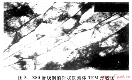 所謂針狀鐵素體型管線鋼,并不是必須100%的針狀鐵素體,而是針狀鐵素體、粒狀貝氏體和少量塊狀鐵素體等的混合組織。對于這種類型管線鋼的組織目前尚無統(tǒng)一的術(shù)語。鑒于針狀鐵素體(又稱板條貝氏體鐵素體)和粒狀貝氏體都屬于貝氏體范疇。因此也有人把針狀鐵素體鋼稱為貝氏體鋼。圖3是X80針狀鐵素體型管線鋼TEM(透射電子顯微鏡)形貌。