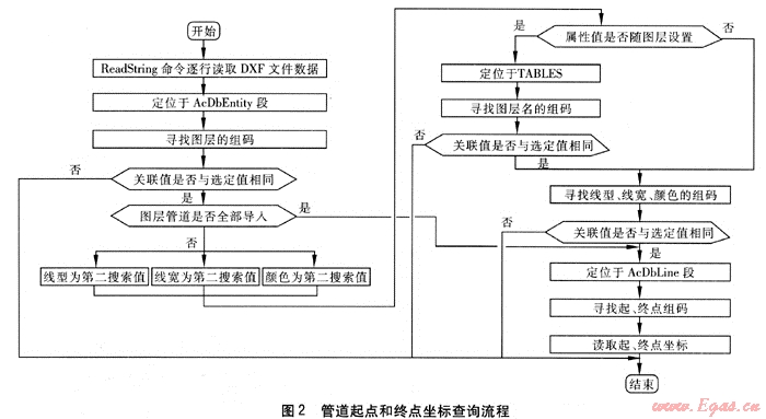 圖2為管道的起點(diǎn)和終點(diǎn)坐標(biāo)的查詢(xún)流程圖。程序首先打開(kāi)儲(chǔ)存管網(wǎng)信息的DXF文件,調(diào)用VC的ReadString命令逐行讀取管網(wǎng)數(shù)據(jù)。當(dāng)查詢(xún)到儲(chǔ)存線(xiàn)段信息的AcDbEntity段,找到線(xiàn)段的圖層名組碼,如果組碼的關(guān)聯(lián)值與導(dǎo)入管網(wǎng)簡(jiǎn)圖命令對(duì)話(huà)框的選定值相同,接著判斷此圖層中線(xiàn)段是否全部導(dǎo)入,如果全部導(dǎo)入,定位于AcDbEntity段下的AcDbLine子段,讀取線(xiàn)段的起點(diǎn)和終點(diǎn)坐標(biāo);如果還需要根據(jù)圖層中線(xiàn)段的屬性信息進(jìn)一步進(jìn)行篩選,則首先需要判斷是根據(jù)線(xiàn)段的顏色、線(xiàn)型、線(xiàn)寬3個(gè)屬性中哪個(gè)屬性進(jìn)行選擇。例如選擇的是顏色屬性,首先判斷線(xiàn)段的顏色是否隨圖層設(shè)置,如果隨圖層設(shè)置,在TABLES段中,尋找圖層名的組碼,確定組碼的關(guān)聯(lián)值與選定值相同的圖層,接著尋找此圖層名下線(xiàn)段的顏色的組碼,如果組碼的關(guān)聯(lián)值與選定值相同,在AcDbLine段中找到此線(xiàn)段,然后讀取起點(diǎn)和終點(diǎn)坐標(biāo);如果線(xiàn)段的顏色不隨圖層設(shè)置,則直接在AcDbLine段中根據(jù)管道顏色找到該線(xiàn)段的起點(diǎn)和終點(diǎn)坐標(biāo)即可[6~7]。