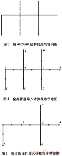 目前已有利用Visual C++開(kāi)發(fā)的水力計(jì)算程序,可以在可視化界面中由用戶(hù)利用鼠標(biāo)點(diǎn)擊繪制管網(wǎng)計(jì)算圖。在管段和節(jié)點(diǎn)附近的空間范圍內(nèi)雙擊鼠標(biāo)左鍵,彈出相應(yīng)對(duì)話(huà)框,輸入管段和節(jié)點(diǎn)參數(shù),實(shí)現(xiàn)管網(wǎng)和數(shù)據(jù)的緊密結(jié)合。同時(shí)程序具有管段刪除、截?cái)?、改變顏色、流向等編輯功能,方便管網(wǎng)的新建和改建。并利用解節(jié)點(diǎn)方程組法對(duì)單氣源與多氣源、高中壓與低壓、環(huán)狀與枝狀管網(wǎng)進(jìn)行快速、準(zhǔn)確的水力計(jì)算,并可將結(jié)果自動(dòng)標(biāo)注在水力計(jì)算圖中[2]。本文在此程序基礎(chǔ)上開(kāi)發(fā)管網(wǎng)拓?fù)浣Y(jié)構(gòu)圖的自動(dòng)導(dǎo)入功能。